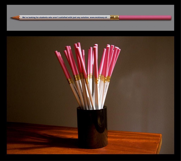 Dieses Bild sieht nicht aus wie eine Jobanzeige im ersten Look, es ist nur ein Bild eines Objekts mit ein paar seltsamen Macken. Die Bleistifte haben einen ungewöhnlich langen Radiergummi, der irgendwie ... sinnlos erscheint. Und dann zoomen Sie ein, um zu sehen, was auf dem Bleistift geschrieben ist ", suchen wir nach Studenten, die mit nur jeder Lösung nicht zufrieden sind." Und plötzlich macht es einen vollständigen Sinn.