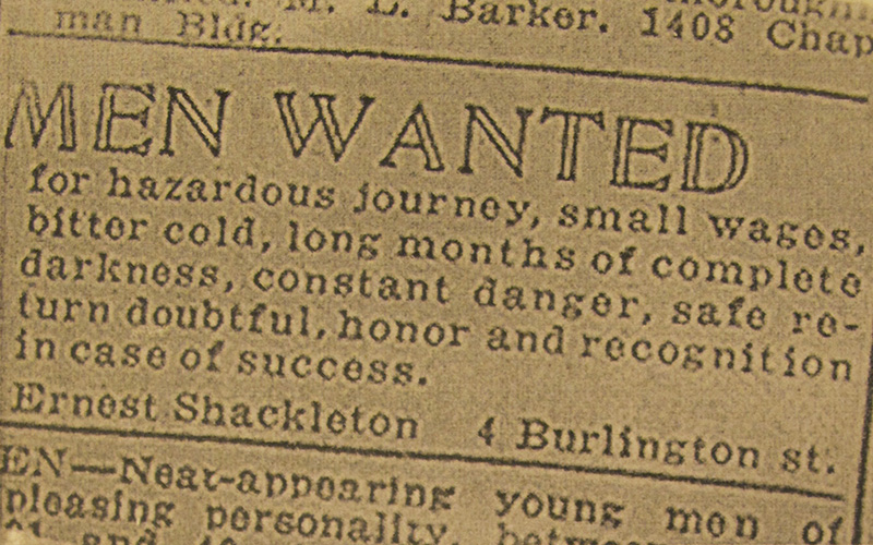 1914 lag Sir Ernest Shackleton eine Stellenanzeige in einer Zeitung für seine Expedition in der Antarktis. Er wusste, dass die Reise nicht einfach sein wird, also hielt er es einfach, brutal, aber ehrlich. "Männer, die für gefährliche Reise, kleine Löhne, bittere kalte, lange Monate voller Dunkelheit, ständiger Gefahr, sicherer Rückkehr zweifelhaft. Ehre und Anerkennung bei Erfolg. " Die Expedition war nicht erfolgreich, da Shackleton es nie zur Antarktis gemacht hat, was diesen düsteren Job völlig authentisch listet.