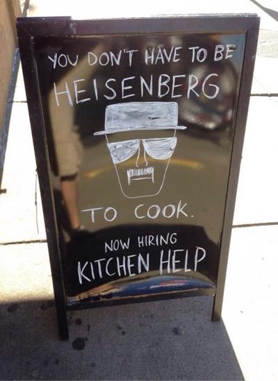 Um diesen zu verstehen, müssen Sie ein Fan der TV-Serie sein, die schlecht blockiert. Heisenberg ist ein Mann, der in Kristall Meth also wieder kocht, es ist ein Wortspiel beim Kochen von Lebensmitteln und Kochen von Drogen in einem Labor! "Sie müssen nicht Heisenberg sein, um zu kochen, jetzt mieten Sie die Küchenhilfe."