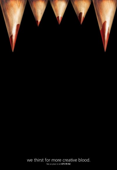 Diese Job-Anzeige verwendet Bildpositionierung und Wordsplay, um etwas wirklich witzig und attraktiv zu erstellen. Die in menschlichen Blut getränkten Vampirzähne sind Stifte auf den Kopf gestellt, die die ultimative Waffe für alle, die Inhalte erstellen. Die Beschriftung zeigt, dass sie sich der kreativen Anzeige bewusst sind, aber sie suchen mehr "kreatives Blut".