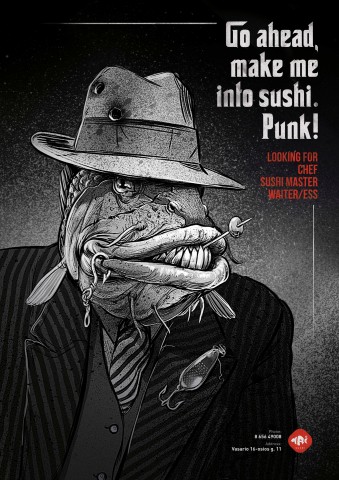 Diese Jobanzeige ist eher ein Poster. Es wurde für ein Sushi-Restaurant entwickelt, das sein Geschäft wiederholen wollte. Ein attraktiver und aus dem Box-System, es macht den Fisch wie jemand aus der Mafia und der Slogan aus, "Gehen Sie voran und machen Sie mich in Sushi, Punk!" Das Poster war so ein Treffer, den sie endeten, dass sie Hunderte von Antragstellern empfangen haben!