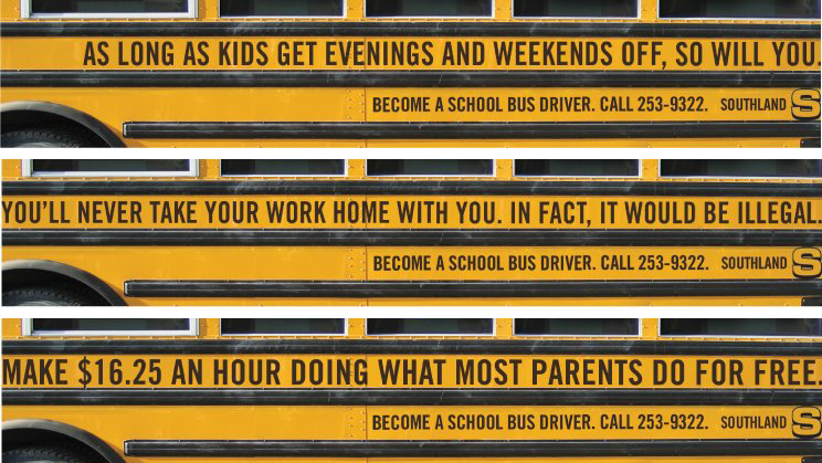 Der nächste Satz von Job-Angeboten wurden auf der Suche nach einer Schule Busfahrer löscht. Die Schule entschied sich die Objekte auf den Schulbussen selbst zu veröffentlichen. Jeder auf den Straßen, einen Blick auf diesen lustigen Einzeiler geschrieben auf den Schulbus gefangen, einige von ihnen waren: „Du wirst nie mit Ihnen Ihre Arbeit mit nach Hause nehmen. In der Tat wäre es illegal sein“und‚tut $ 16.25 pro Stunde machen, was die meisten Eltern kostenlos tun‘.