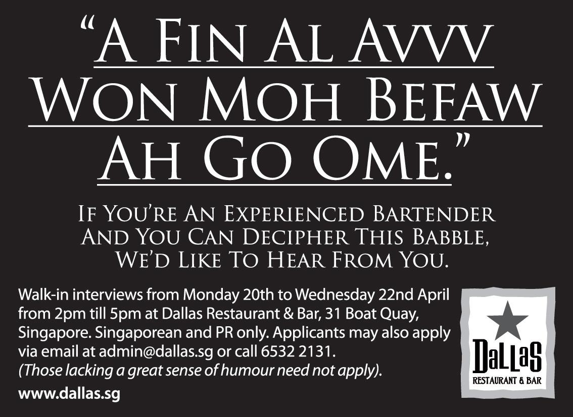 Dallas Restaurant und Bar war auf der Jagd ihren nächsten Barkeeper zu mieten. Um ihre Bewerber die Fähigkeiten zu testen, setzen sie einen Code in ihre Anzeige, die Förderung nur diejenigen anzuwenden, die lesen können, was es sagt. Diese auffällige Anzeige endete mit einem Disclaimer, der lesen: „Diejenigen, einen großen Sinn für Humor ist nicht zwingend, fehlen“