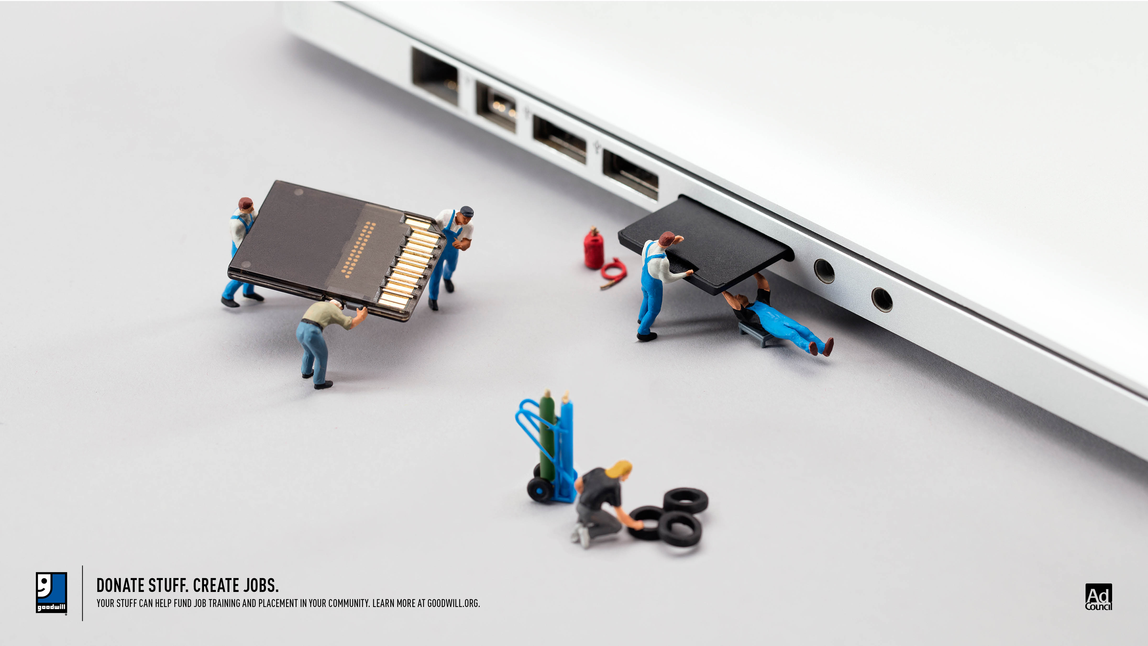 Dieses Bild veranschaulicht einige winzige Figuren in Aktion, die eine Vielzahl von qualifizierten Arbeitsplätzen durchführen, indem er mit lebensgrößen gespendeten Objekten verwendet wird. Dieser Versuch wurde unternommen, Spenden zu fördern, die zu Arbeitsplätzen aus Schulungen und Platzierungsmöglichkeiten führen können. Es schließt mit der TAGLINE ab, "Spenden Sie Sachen. Arbeitsplätze schaffen."