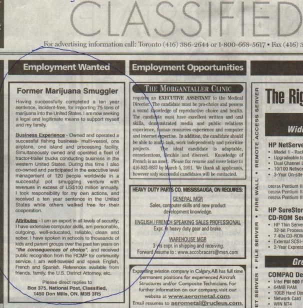 Im Jahr 2006 veröffentlichte ein ehemaliger Marihuana-Smuggler eine Anzeige in einer Toronto-Zeitung. Die Anzeige erwähnt, dass er jetzt nach einem Job sucht, nachdem er seinen zehnjährigen Satz im Gefängnis für den Import von 75 Tonnen Drogen bedient. In seinen Fähigkeiten und Attributen listet der Mann "Executive Level Management von 120 Personen weltweit", "ein Experte auf allen Ebenen der Sicherheit" und "Referenzen, die von Freunden, Familie, der US-amerikanischen Bezirksanwalt usw. verfügbar sind", die anscheinend über 600 erhielt Antworten.
