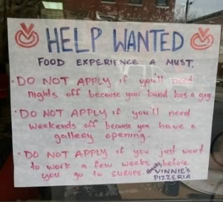 Vinnies Pizzeria hat einen Job auf dem Fenster aufgeführt sind, die eine ziemlich strenge Regeln musste auch für den Job zu bewerben. Die Anzeige gelesen, „gilt nicht, wenn Sie Nächte ab benötigen, weil Ihre Band einen Auftritt hat. Gelten nicht, wenn Sie freie Wochenenden benötigen, weil Sie eine Galerieeröffnung haben. Gilt nicht, wenn Sie nur ein paar Wochen arbeiten wollen, bevor Sie nach Europa zu gehen.“