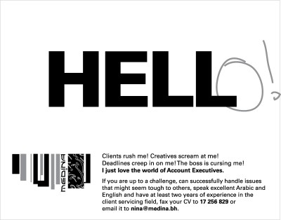 Diese Job-Posting tat den perfekten Trick, um auffällig zu sein. Es spielte mit dem berühmten Unternehmen, Apples Logo. So letztendlich, wer sich diese Anzeige ansieht, nimmt es letztlich an, es ist eine Anzeige von Apfel, die mehr Aufmerksamkeit erregte, als es normalerweise hätte. Dann sagt es ganz unten, "Hungry Designer wollten mit Kontaktinformationen verbunden sein.