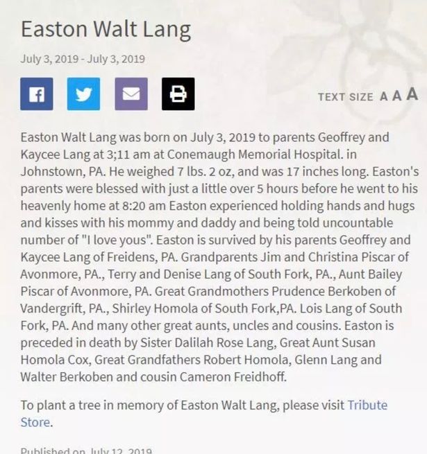 Ihr Nachruf begann, "Eastons Eltern waren mit nur ein bisschen über 5 Stunden gesegnet, bevor er um 8:20 Uhr in sein himmlisches Zuhause ging. Easton erlebte Händchen und Umarmungen und Küsse mit seiner Mama und Papa und erzählte unzählige Anzahl von "Ich liebe dich".