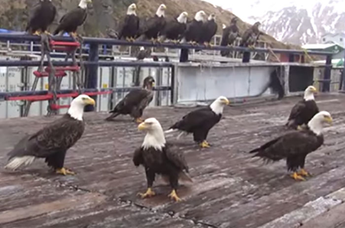 Plötzlich kam eine ganze Herde aus kahler Adlern am Dock. Von nur einem Vogel bis fast zwanzig Vögel war das gesamte Boot mit Eagles bedeckt. Jessie wurde verblüfft. Er hatte nie erwartet, dass er mit so vielen majestätischen Vögeln umgeben war. Der Anblick war schon unheimlich, und Jessie tat etwas noch gefährlicher.