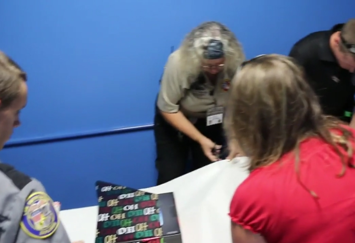 Die Offiziere konnten das alles sehen, was in Echtzeit auf einem Monitor-Bildschirm stattfanden, den sie über die Kameras in ihren Kreuzer aufgestellt hatten, die sie auf dem Parkplatz des lokalen Walmarts installiert hatten. "Es hätte ein Geschenk von 5 US-Dollar oder ein Paar-Hundert-Dollar-Geschenk sein können und nur jemandem helfen können, es ist nur die Tat, gutes Verhalten oder eine gute Tat zu erkennen", sagte der Offizier Joseph Fabell.