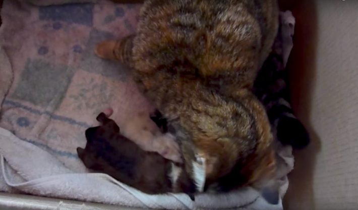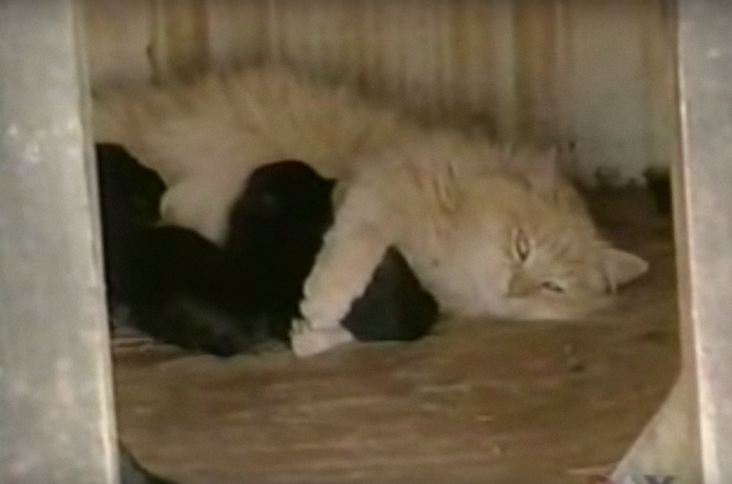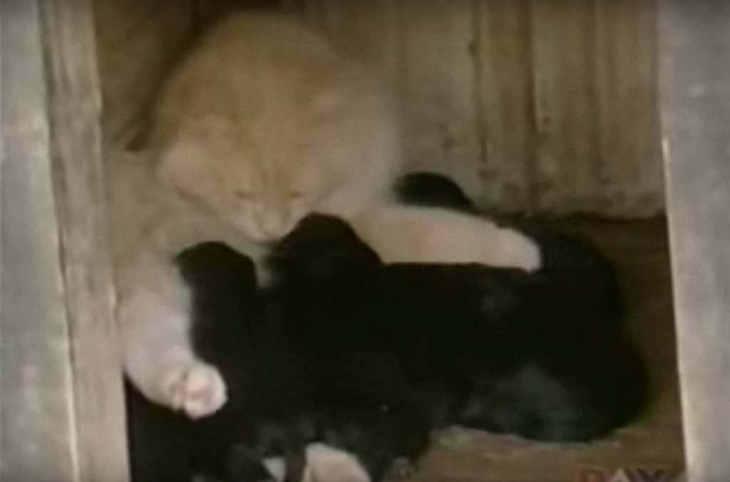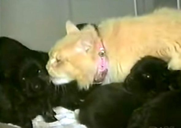Miss Kitty hatte die Welpen alle gesteckt, weil sie sie pflegen wollte. Obwohl sie ihre Kätzchen verloren hatte, übernahmen ihre mütterlichen Instinkte. Sie konnte nicht sehen, wie die Welpen so ignoriert wurden. Sie zog die Babys an ihren Anhänger und schützte sie dort, um sie zu füttern.