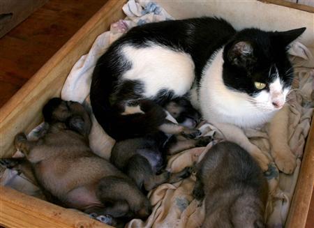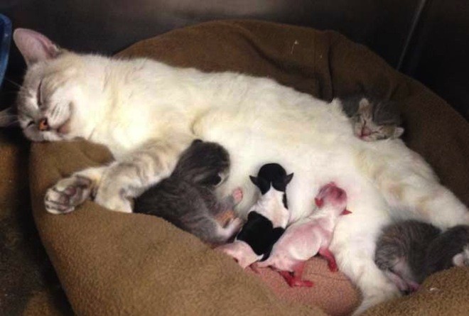 Für Miss Kitty waren diese Welpen nicht "Welpen". Zu sie waren diese Babys, ihre Kätzchen. Und alles, was sie wollte, sollte sich um sie als ihre Mutter aufpassen. Sicherlich lieferten diese Welpen ihr die Trost, die sie nach dem Tod ihrer Kätzchen vermisst hatte.