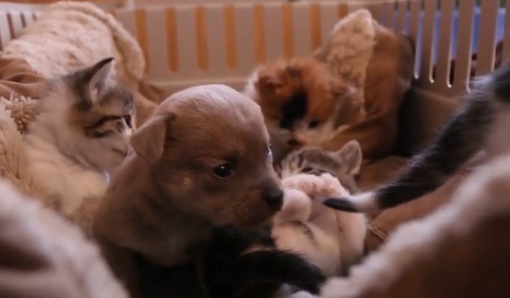 Gwen eine Mutter an den Welpen nicht nur, sondern auch die Kätzchen genossen sein Unternehmen. Als ob sie Geschwister waren. Das ist einfach so entzückend und süß. Ist es nicht? McTigue sagt weiter: "Die Katze war sehr zufrieden mit all ihren kleinen Jungs, die herumlaufen, also scheint es wie eine perfekte Passform."