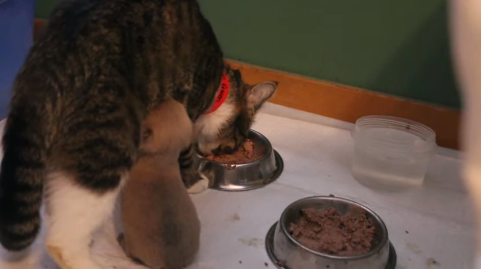 Genau wie eine perfekte Mutter, würde Gwen zuerst ihre Kätzchen füttern und würde sich um sie kuscheln, nur um sie warm zu machen. Für die ersten Wochen ließ die Katze niemanden näher an sie und ihren Babys. Wenn also dieser neue Eindringling an die Gesellschaft kam, wusste niemand, dass die Katze, die dieser Schutz war, aus dem Weg gehen und so etwas tun würde.