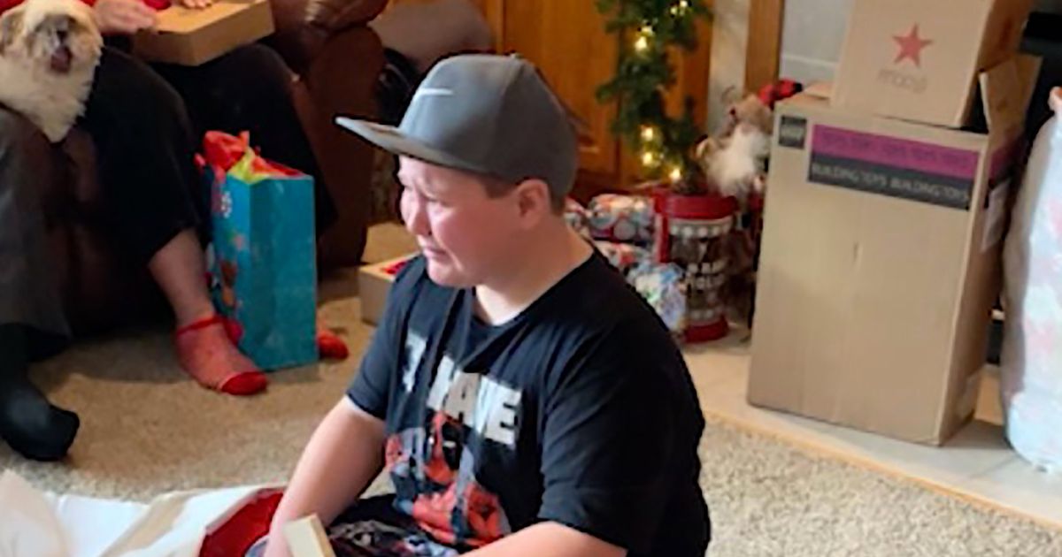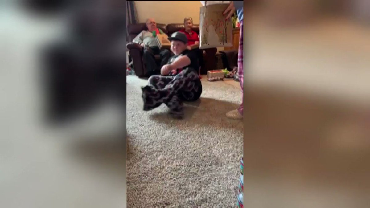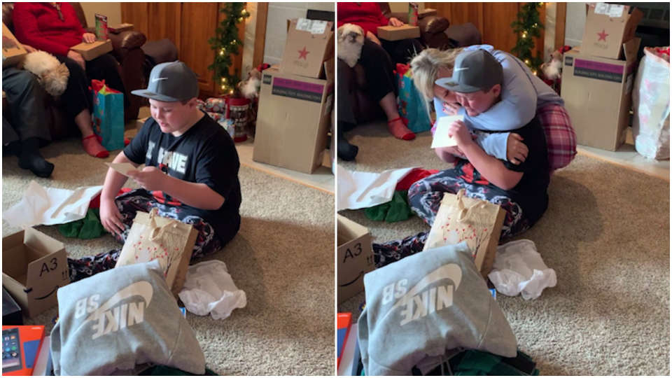 Alle Augen im Zimmer waren auf einem kleinen Jungen, als er hinter seinem Weihnachtsgeschenk eine verborgene Note findet