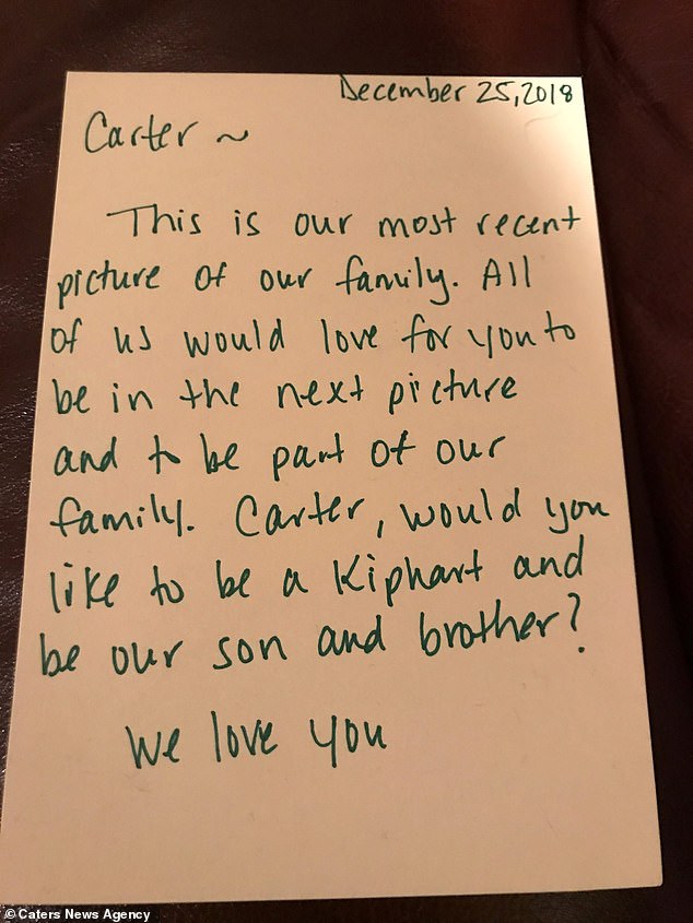 Die Notiz Lesen: "Hier ist das letzte Bild unserer Familie. Wir alle würden es lieben, dass Sie im nächsten Bild sein, und für Sie, um ein Teil unserer Familie zu sein. Carter, möchtest du ein Kiphart sein und unser Sohn und Bruder sein? " Dies war, was er mit den geringsten Erwartungen dieses Wunschs gewünscht hatte, jemals erfüllt zu werden.