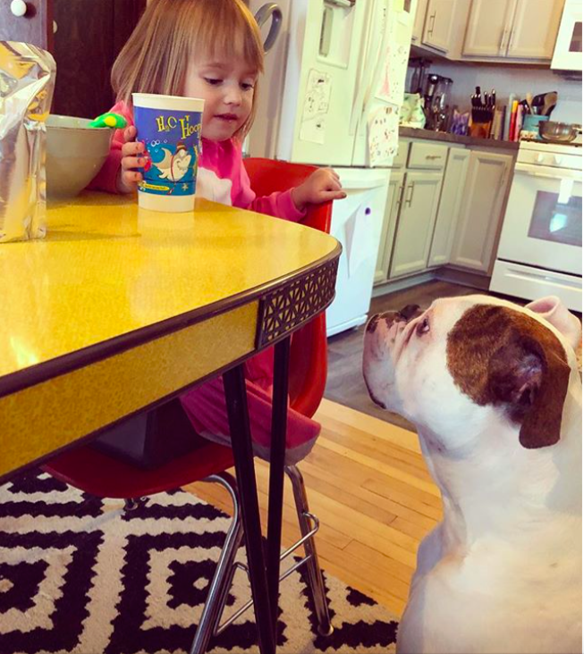 Emily stellte weiter an, "Ihre Foster Mama, Victoria, sagte mir, dass sie missbraucht und vernachlässigt worden war. Ich hatte erwartet, dass sie schüchtern, aggressiv oder ängstlich war. Stattdessen saßen wir auf dem Boden, um sie kennenzulernen, und sie legte ihre 74 Pfund direkt über meinen 30-Pfund-4-jährigen. " Sie erklärte auch, wie sie das Gefühl hatte, sie zu sehen. Für sie war es wie "Liebe auf den ersten Blick".