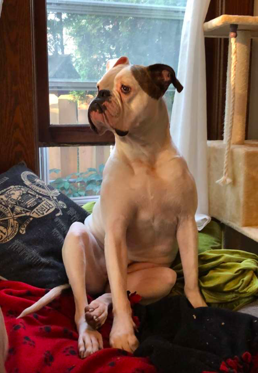 Emily beschreibt den neuen Zusatz: "Wir haben unsere Brutz ein neuer Kumpel hinzugefügt! Das ist Juno. Sie ist 5 Jahre jung und hat den glücklichsten Schwanz, den wir je getroffen haben. Sie wurde die ersten 4,5 Jahre ihres Lebens missbraucht, aber trotzdem vertraute alles immer noch vertrauensvoll und liebevoll. Alles, was sie will, ist ein Schoß, um sich zu kuscheln und jemanden, der ihre Pfote hält. Farn ist wahnsinnig verliebt in sie. Wir lieben sie so sehr und können es kaum erwarten, ihr Leben zu machen, das sie liebt. "
