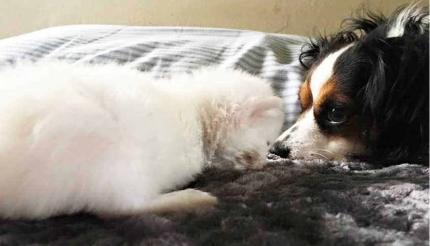 Megan's Dog, Bitsy, begann Zuneigung für die kleinen Kätzchen zu zeigen. Als Megan das spürte, dass es sicher war, das Kätzchen mit Bitsy zu verlassen, ließ sie sie nahe kommen. Und das hat sie diesem atemberaubenden Moment angetroffen.