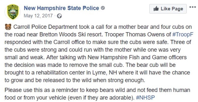 Thomas nahm sofort den Babybären auf und nahm es zum Auto. Er hielt das Baby auf dem Vordersitz seines Autos und tat schnell das, was er als das Beste sei. Er nahm das Baby in das neue Hampshire Fish and Game Center. Diese Szene verließ Thomas, wodurch der Mutterbär ihr Baby hinter sich ließ.