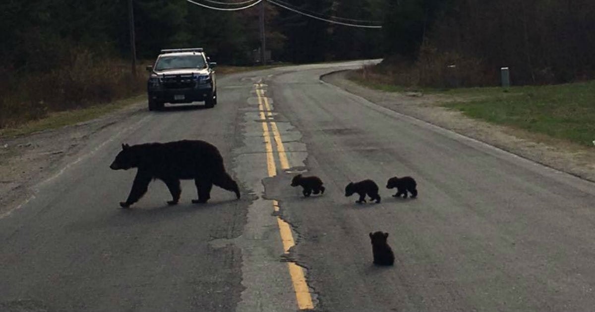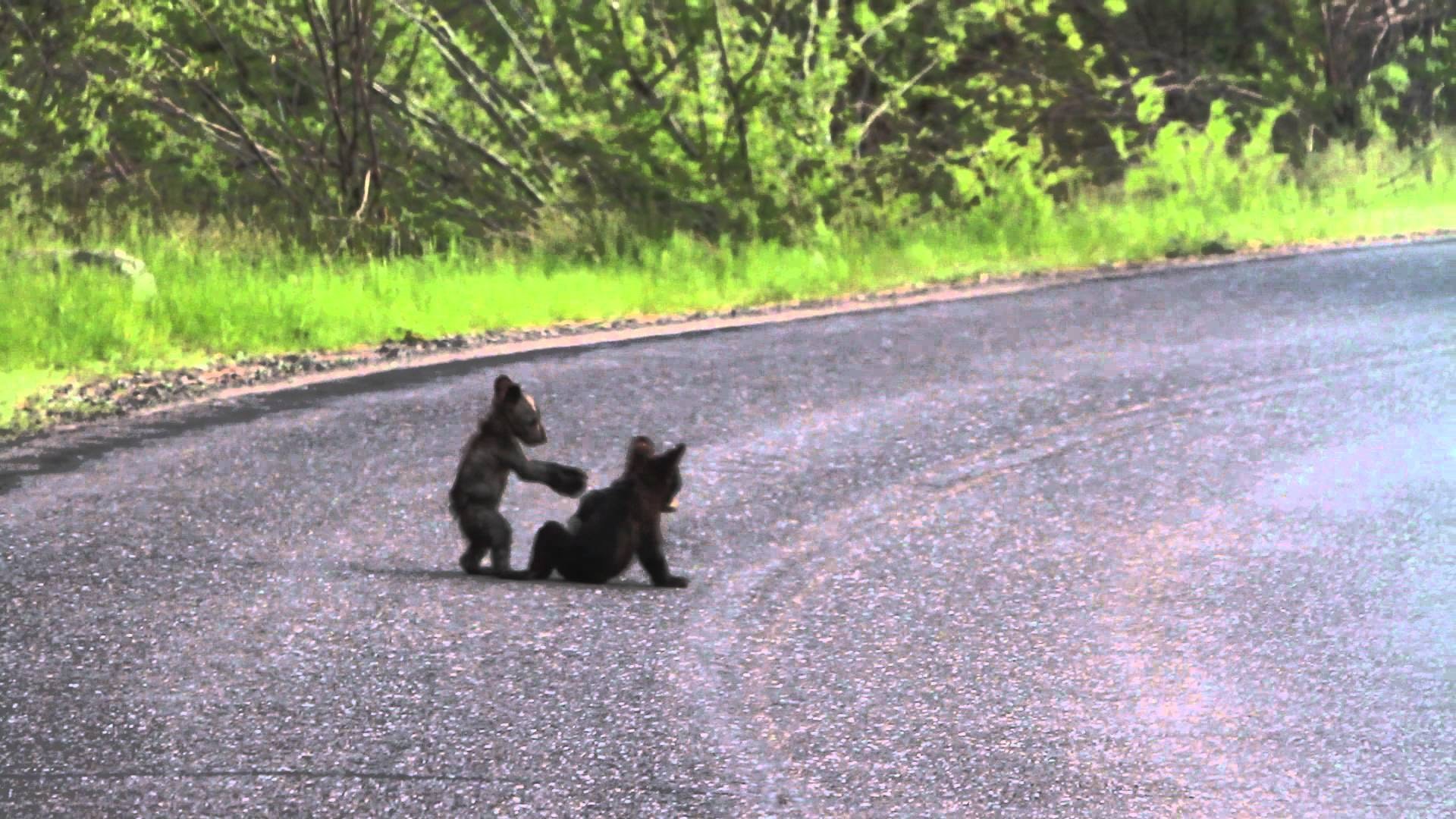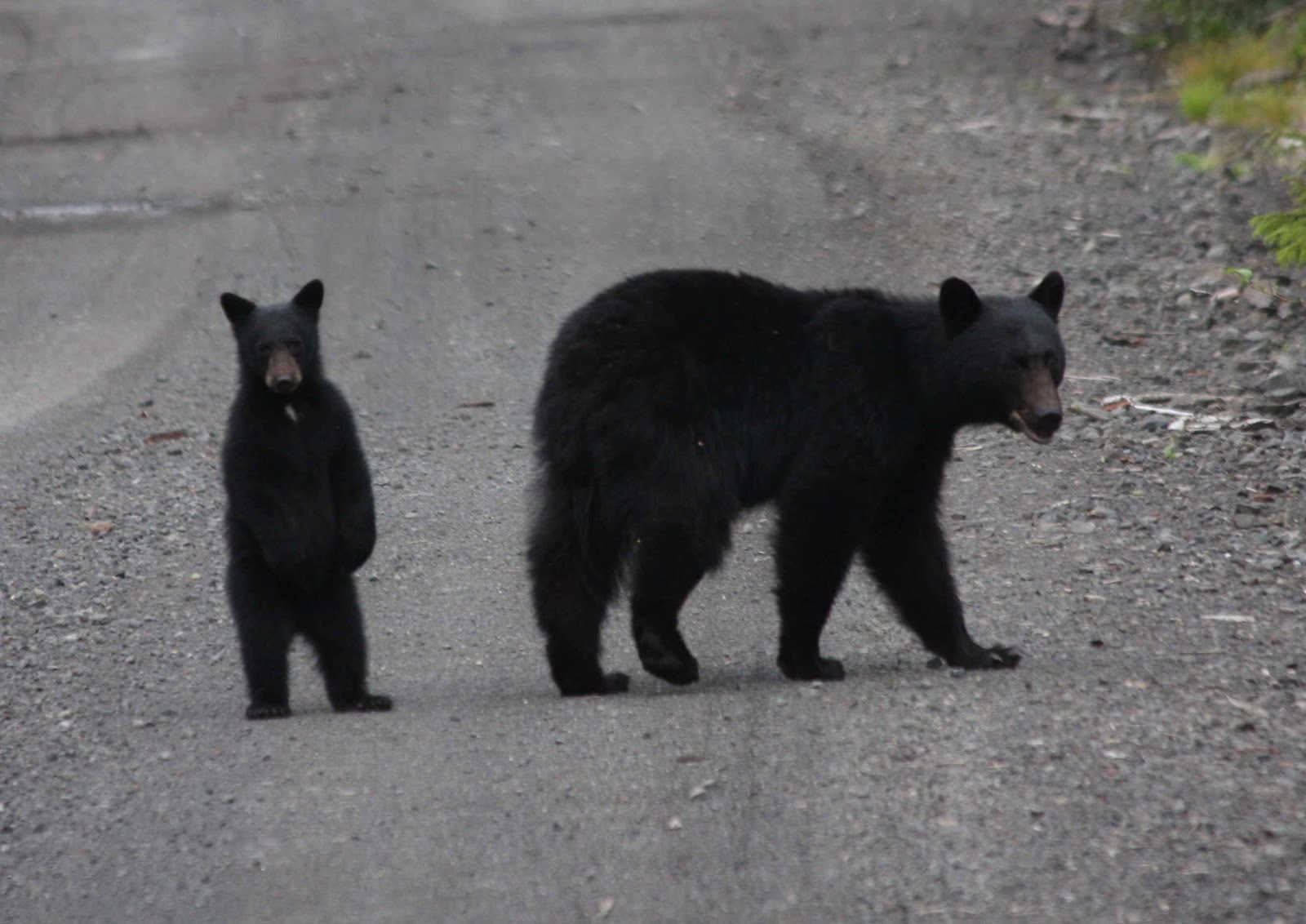 Thomas bemerkte, dass dies ein Mutterbär mit ihren Jungen war. Es sah aus, als würden sie versuchten, die Straße zu überqueren, aber einer der Jungen wurde auf der anderen Seite zurückgelassen. Das Junge konnte sich nicht bewegen und der Mutterbär konnte keiner von Babys hinterlassen.
