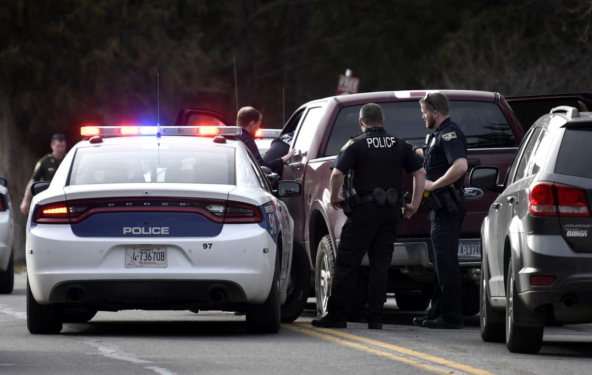 Verwirrter Polizist versucht, einen genaueren Blick zu ergreifen, wenn ein Bär sich weigert, von einer seltsamen Vernunft von der Straße zu ziehen