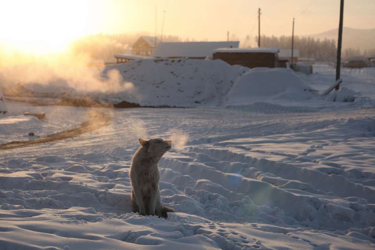 Hunderassen, die dickes Fell wachsen, können in diesem Dorf überleben. Dieses Bild ist von einem Hund, der ein ziemlich dickes Fell hatte, um in der Kälte warm zu bleiben. Welpen brauchen jedoch mehr Sorge. Sie haben zum Zeitpunkt der Geburt kurze Haare und wenn sie nicht an einem warmen Ort aufgenommen werden, sind ihre Überlebenschancen minimal.