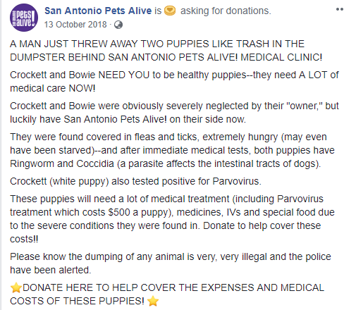 Carolyn Hinojosa, Assistant Clinic Director, kritisierte diejenigen, die die Welpen in der Mülleimer abgeladen hatten, indem sie sagen: "Eines, das illegal ist, zwei, das ist unmenschlich. Wenn Sie Ihr Kind nicht mochten, würden Sie sie in einen Müllcontainer werfen? Die Polizei wurde benachrichtigt, sie suchen nach Verdächtigen, die sie entlassen haben. " Nein, nicht zu erwähnen, dass beide Welpen Nahrung beraubt wurden und mit vielen Krankheiten zugefügt wurden.
