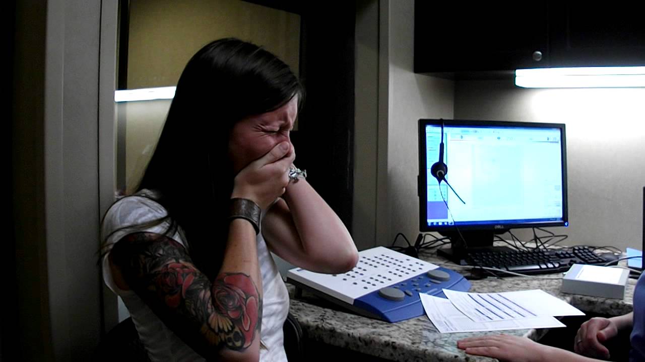 In diesem Moment konnte Sarah zum ersten Mal ihr eigenes Gelächter hören, was sie schnell machte, um unkontrolliert zu lachen. "Ich möchte mich nicht weinen hören", sagte sie nach ein paar Minuten. Als ihr Ehemann Sloan saß, saß sie ihr mit ihrer ersten Reaktion, sah sie ihn lachend an. Alles, was sie hörte, war ein neuer Sound für sie und es hat sie ziemlich aufgeregt.