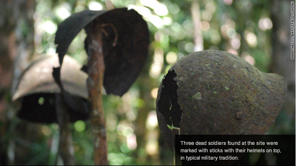 Ein WWII Battlefield, das immer noch alle Dienstprogramme der japanischen Soldaten in den Dschungeln von Papua-Neuguinea im Jahr 2010 entdeckt worden war. Der ehemalige Armee Captain Brian Freeman Dieser Ort in etwa einer halben Meile vom Dorf Eora Creek entfernt. Dies war der Ort, an dem der letzte große Kampf zwischen Australien und Japan stattfand. Dies war ein Jagdboden für die Einheimischen, aber dieses Schlachtfeld wurde nicht in Bezug auf die Toten verwendet, und die Spirituosen der verstorbenen Soldaten wurden angenommen, dass sie hier streiken.