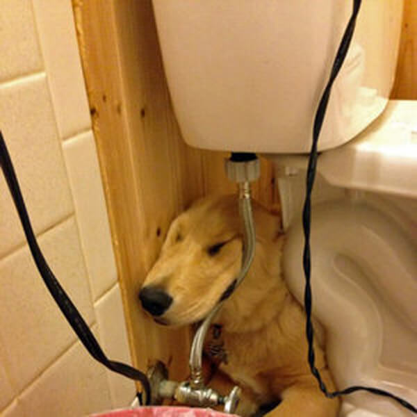 Wie passt dieser Hund an, dass dieser winzige Raum hinter der Toilette etwas anderes ist. Und wie schläft er sogar darüber, ist auch verwirrend? Aber dann ist das ein Haustier. Er kann schlafen und an einem beliebigen Ort reinigen und an jedem Ort mögen. Vielleicht, während er sich verstecken und mit seinem Vater suche, versteckte er sich dort und sein Vater hat wahrscheinlich vergessen, ihn zu finden und schläft auch.