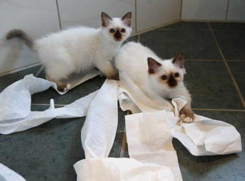 Eine einzelne Katze, die beunruhigend ist, ist bereits zu viel und bildete das Problem mit doppelten Katzen. Sie haben bereits angefangen, mit dem Toilettenpapier zu spielen, und nun spritzen sie überall Wasser, und dann werden sie diese Duschvorhänge kratzen. Und man hat keine andere Wahl, als mehr von Toilettenrollen und Duschvorhängen zu kaufen.
