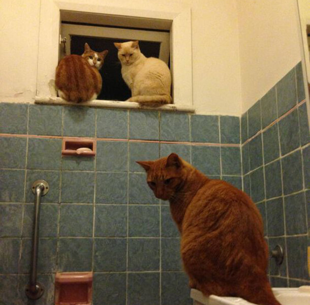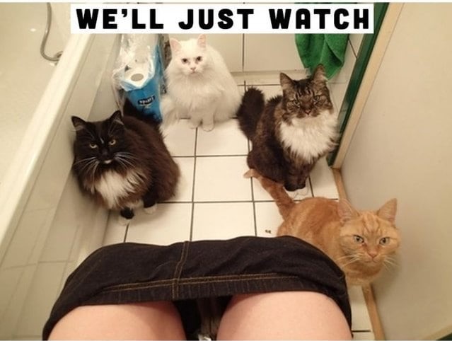 Dad, wir begleiten Sie einfach hier. Was passiert, wenn Sie nichts langweilen und zu tun? Voila! Wir sind hier, Sie zu unterhalten. Was dachten diese Katzen auch während der ins Bad treten? Wie wir sehen wie Poop Menschen? Oder vielleicht wie kann man einen Toilettensitz benutzen? Was auch immer es könnte diese Katzen gewesen sein müssen den Mann sein Erschrecken sitzen. Wie eine ganze Armee ist da, um ihn zu attackieren.