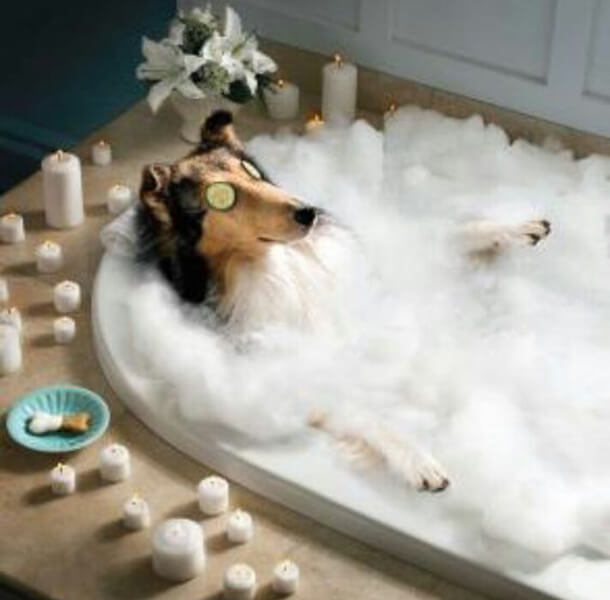 Dieser Hund hat ein Wochenende sicher besser als die Mehrheit von uns. Ein solcher erholsamer Tag hat er. Aber wessen Hund ist das? Es muss zu einer hochwertigen Dame gehören. Wie gut sind diese Gurkenscheiben, die platziert sind und diese Kerzen in der Umgebung beleuchten. Das ist ein Reliefbad. Hey Junge, wenden Sie sich auch ein Gesichtspaket an.