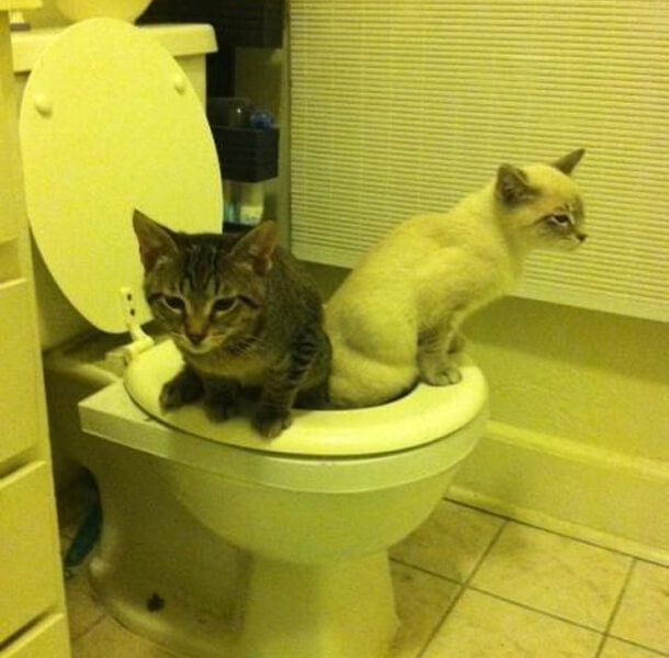Bevor Sie irgendwelche Erraten machen, lässt sich dieser Anblick ein lachen. Was hast du da zusammen getan Kätzchen gemacht? Haben Sie argumentiert, wer zuerst pee wird? Zusammenfassend zusammen muss hart sein, aber Sie sehen beide wirklich süß aus. Einfach nicht beim Herauskommen.