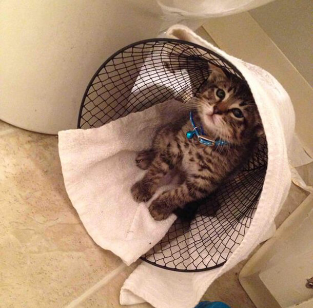 Diese Katze scheint sich zu verstecken und mit ihrem Besitzer zu suchen. Und sie beschließt, sich in diesem Müllbehälter zu verstecken. Glücklicherweise ist sie der intelligente und verwendet sogar ein Handtuch, um sich davon abzudecken, erwischt zu werden. Sie weiß nicht, dass sie eigentlich im Müll enden würde, wenn ihr Besitzer sie mit sauberen Badetüchern findet.