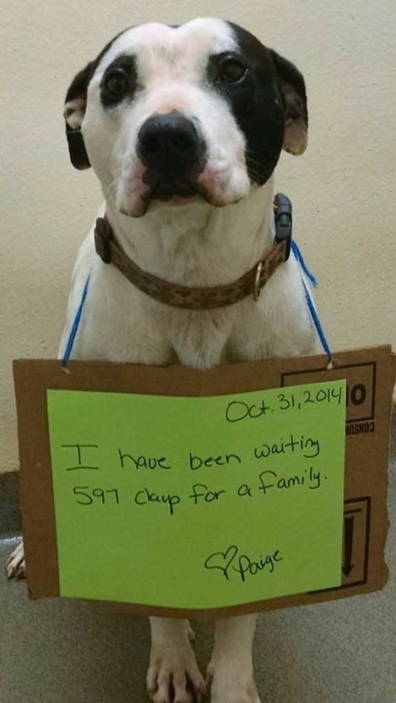 Paige wurde am 8. März 2013 in Franklin County Humane Society gebracht, und die Unterkunft der Arbeiter waren aufgrund seiner sanften Natur wirklich zuversichtlich. Aber mehr als ein Jahr vergingen, Paige war immer noch im Tierheim und dann versuchte eines der Mitglieder des Personals etwas anderes. Er machte ein Foto von Paige, das ein Zeichen trägt, das las, "Ich habe 597 Tage für eine Familie gewartet" und auf Facebook gepostet. Dieses Foto erreichte mehr als & Millionen Menschen und genau eine Woche später, wurde Paige angenommen. Wir hoffen, dass es ihm gut geht.