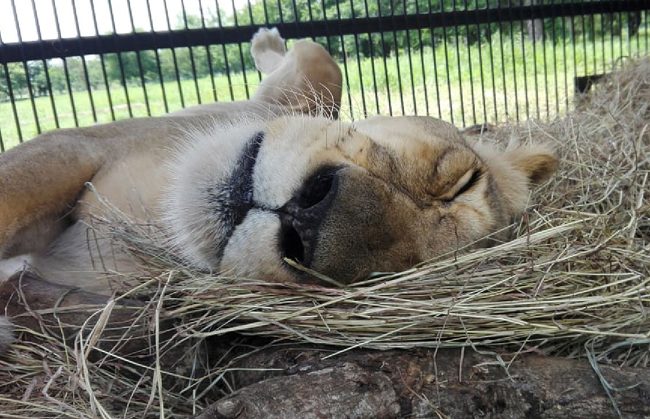 Sobald das Team der Tierdefender International mit den temporären Häusern der Löwen durchgeführt wurde, könnten diese Gruppe von fünf großen Katzen jetzt in einem riesigen Bereich bleiben, mit Gras bedeckt. Leider haben alle 5 von ihnen, Sasha, Nena, Kimba, Tanya und Tarzan noch nie auf Gras geschlafen. Ihre alten winzigen Käfige hatten Boden und kein Gras dabei. Kurz gesagt, dies wollte gerade das erste Mal sein, dass diese Tiere den Trost des Gras spüren.