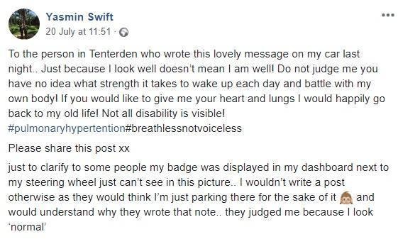 "Ich sah die Notiz, die Sie auf meinem Auto verließen, und dies ist das, was ich zurück sagen möchte ... Letzte Nacht ging ich mit meinem Freund in den weißen Löwen in Tenternden und parkte mein Auto außerhalb von Prezzo im behinderten Raum und ehrlich, ich habe es nicht getan Ich denke an etwas davon. Ich war wütend und frustriert. " Sie schrieb weiter in den Beitrag.