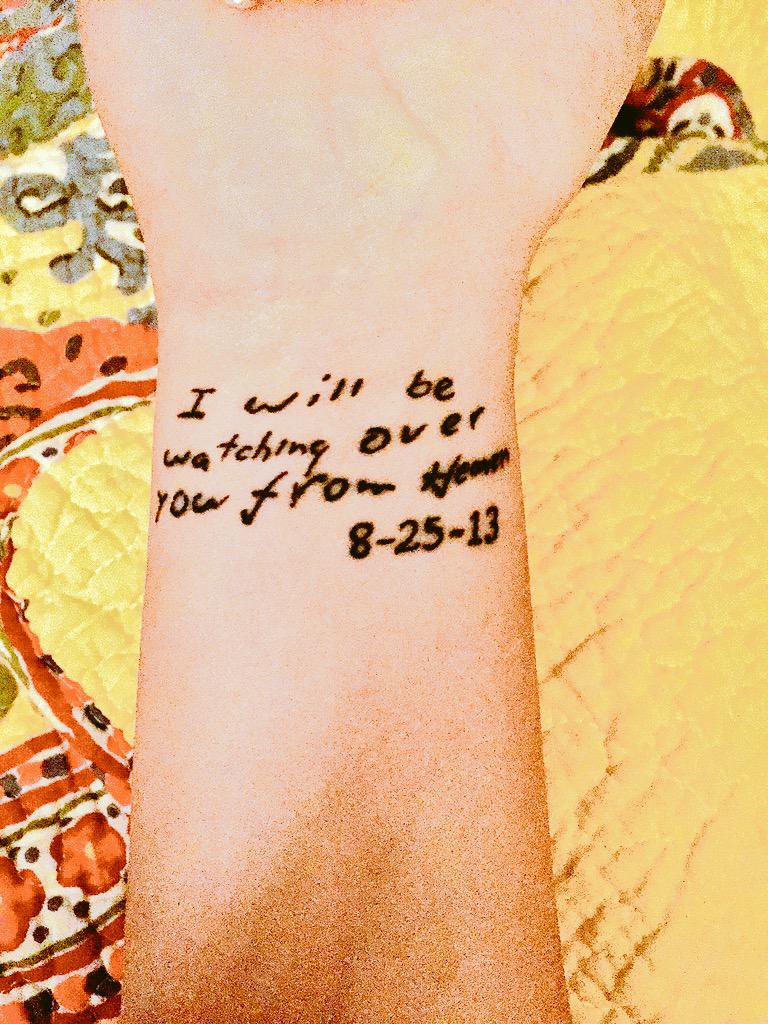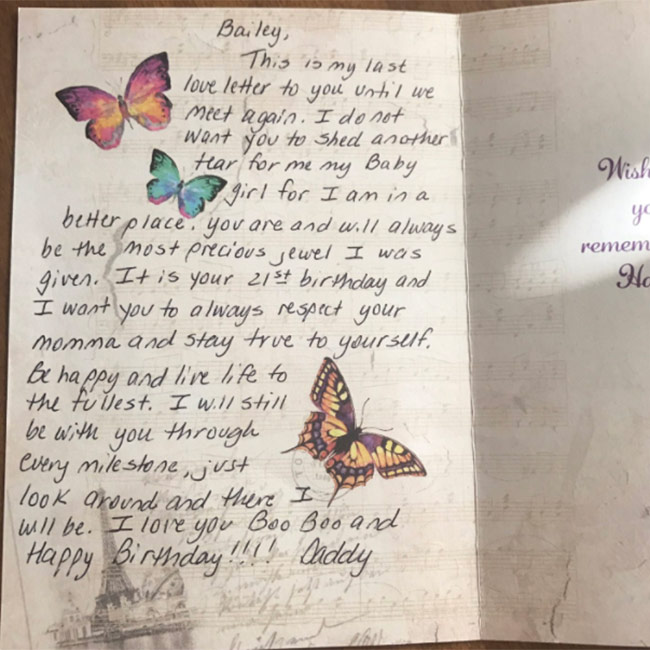 So glücklich, wie Bailey die endgültige Note lesen sollte, dass ihr Vater sie verließ, ihr 21. Geburtstag war auch die raue Realität, dass sie keine Karten oder Blumen aus ihrem verstorbenen Vater aus dem nächsten Jahr bekomme. Sie hatte einige schöne und herzwärmelige Noten von ihrem Vater über ihre letzten 5 Geburtstage erhalten. Sie entschied sich, ein Tätowierer auf ihrem rechten Handgelenk des letzten Anmerkung ihres Vaters zu bekommen, der seiner Handschrift erinnert.