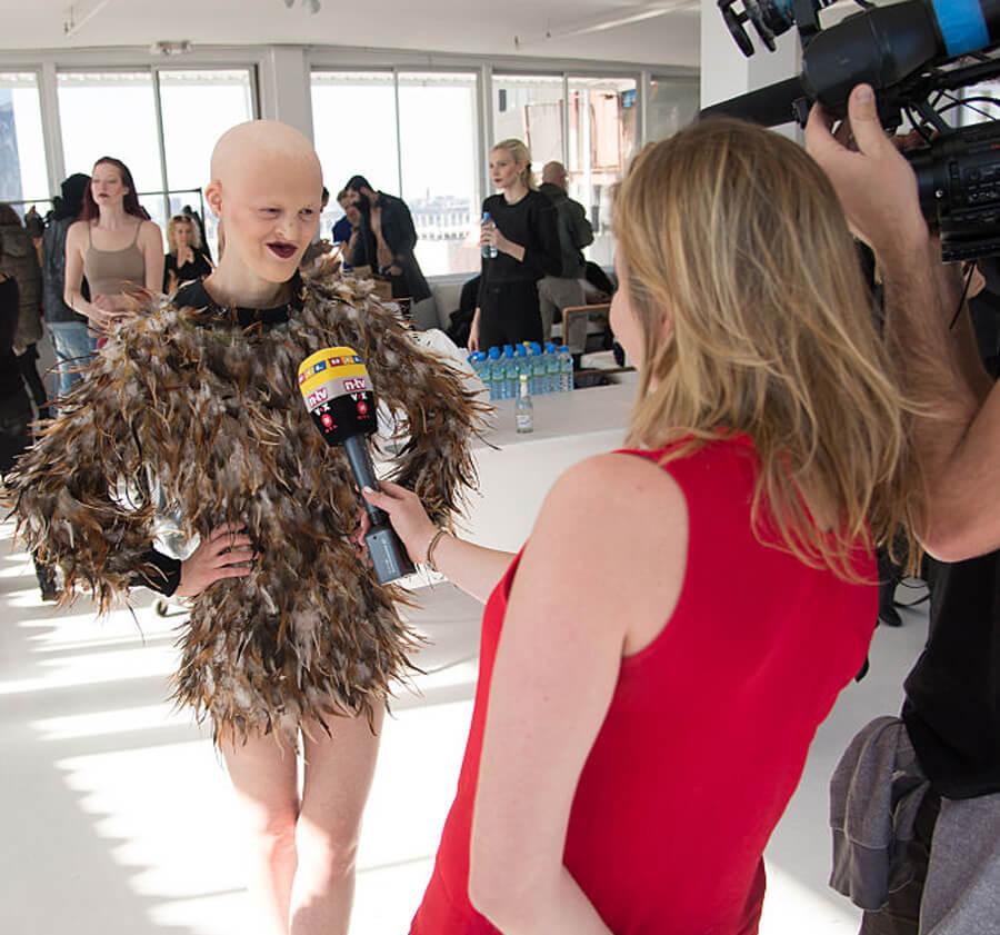 Dieses inspirierende Modell heißt Melanie Gaydos, der 29 Jahre alt ist. Sie hat einen Erkrankungszustand, der als Ektodermale Dysplasie bekannt ist. Dies bedeutet grundsätzlich, dass ihre Knochen, Zähne, Nägel und Poren ungewöhnlich geformt oder geformt sind. Melanie ist auch teilweise blind und hat Alopezie, die zu ihrem kahlen Kopf geführt hatte. Sie ist ein Kunstgraduierten, der etwas Spaß gemacht hat. Sie sammelte viel Summen, und selbst sie war angenehm überrascht, dass sie von der Aufmerksamkeit erregt, die sie erhielt. Miley Cyrus liebt ihre Arbeit und ist ein großer Fan von ihr.
