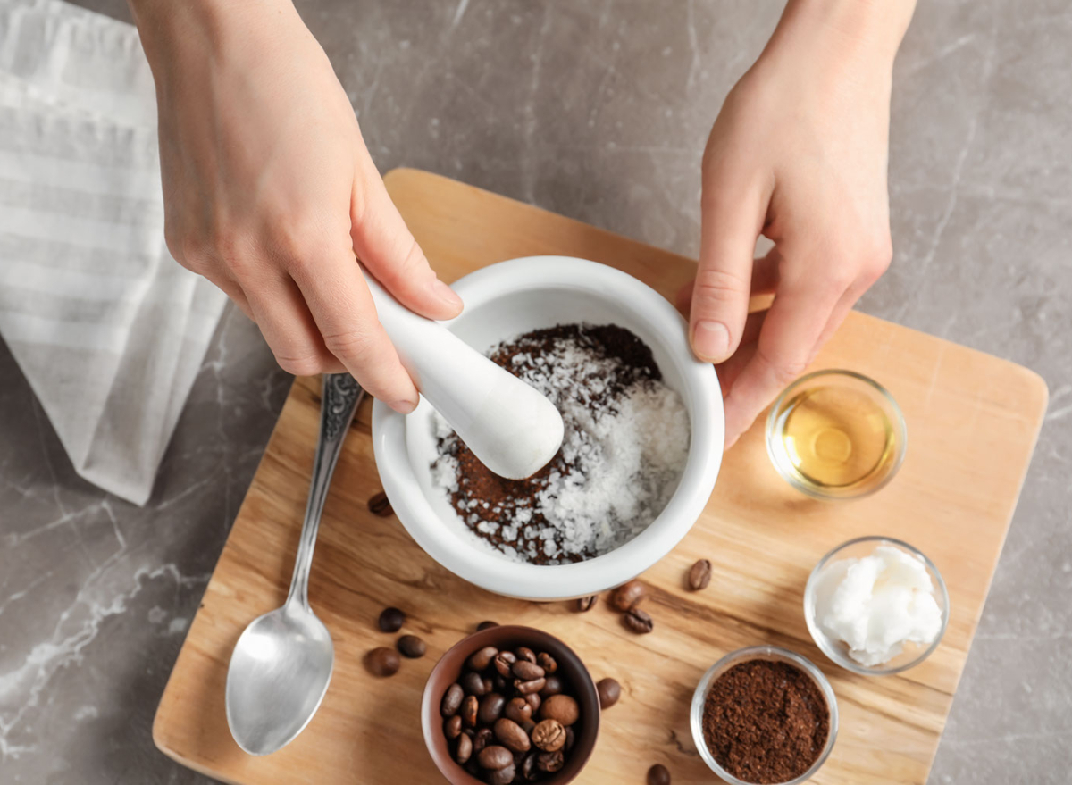 Mischen Sie zum ersten Mal drei Esslöffel Kaffeegelände mit einem Esslöffel Mandelöl und Aloe Vera Gel.