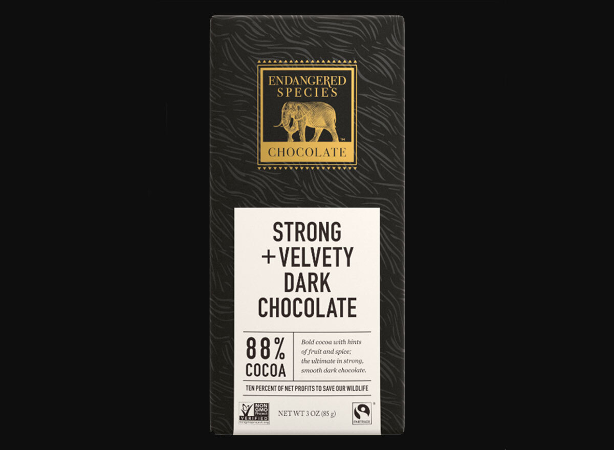 Gefährdete Arten ist ein weiterer Fairtrade-Schokoladen-Barproduzent, der eine Vielzahl von dunklen Schokoladenoptionen bietet, darunter Haselnuss-Toffee, Tart-Himbeere und Zimt und Cayenne. Hier ein Interesse ist der Panther, der auch als starke + samtige dunkle Schokolade bezeichnet wird, die 88 Prozent Kakao-Feststoffe und Uhren in 11 Gramm Nettokohlennehmern pro Portion enthält.