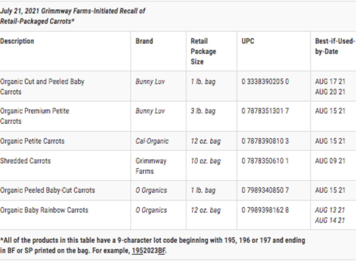 Ihre Pressemitteilung fügt hinzu, dass zusätzlich zu den auf diesem Diagramm aufgeführten ergebenden Erzeugnisse gewissermaßen an bestimmte zerkleinerte Karotten und gehackte (Chunk) -Karotten zurückgerufen wurden, die an Lebensmittelhersteller und Lebensmittelservice-Händler verkauft wurden. Alle betroffenen Lebensmittelhersteller, Lebensmittelservice-Distributoren und Einzelhandelskunden wurden mit einem Großteil des Produkts mitgeteilt, bevor es für den Verbrauch zur Verfügung gestellt wurde. "