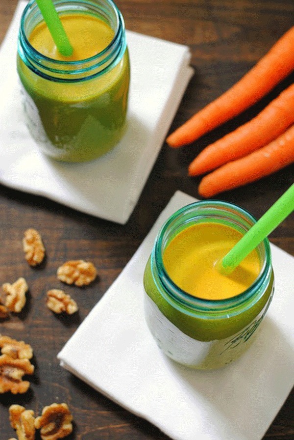 Dieser Karottenkuchen-Smoothie ist reich an gesunden Fetten: mehrfach ungesättigte Fettsäuren, wie in Walnüssen, können die diätetische Kalorienbrenne erhöhen und die Stoffwechselrate ruhen. Und Walnüsse haben mehr Herz gesunde Omega-3-Fettsäuren als jede andere Nuss! Bonus: Eine Tasse dieses Smoothie bietet einen Tag im Wert von Vitamin A.