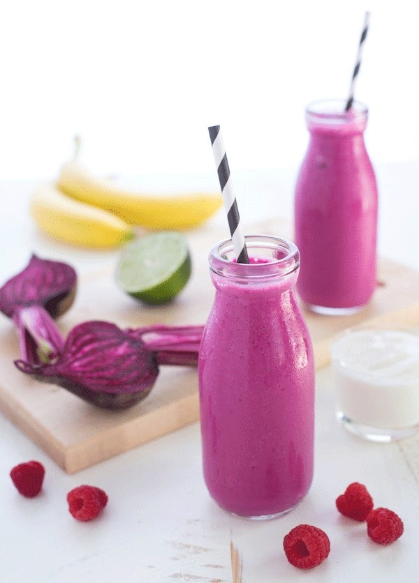 Fasergefüllte Himbeeren und energiereiche Rüben mit Bananen, fettarmen Milch und griechischem Joghurt. Es ist ein großartiges Erholungsgetränk von Post-Workout für nur 170 Kalorien.