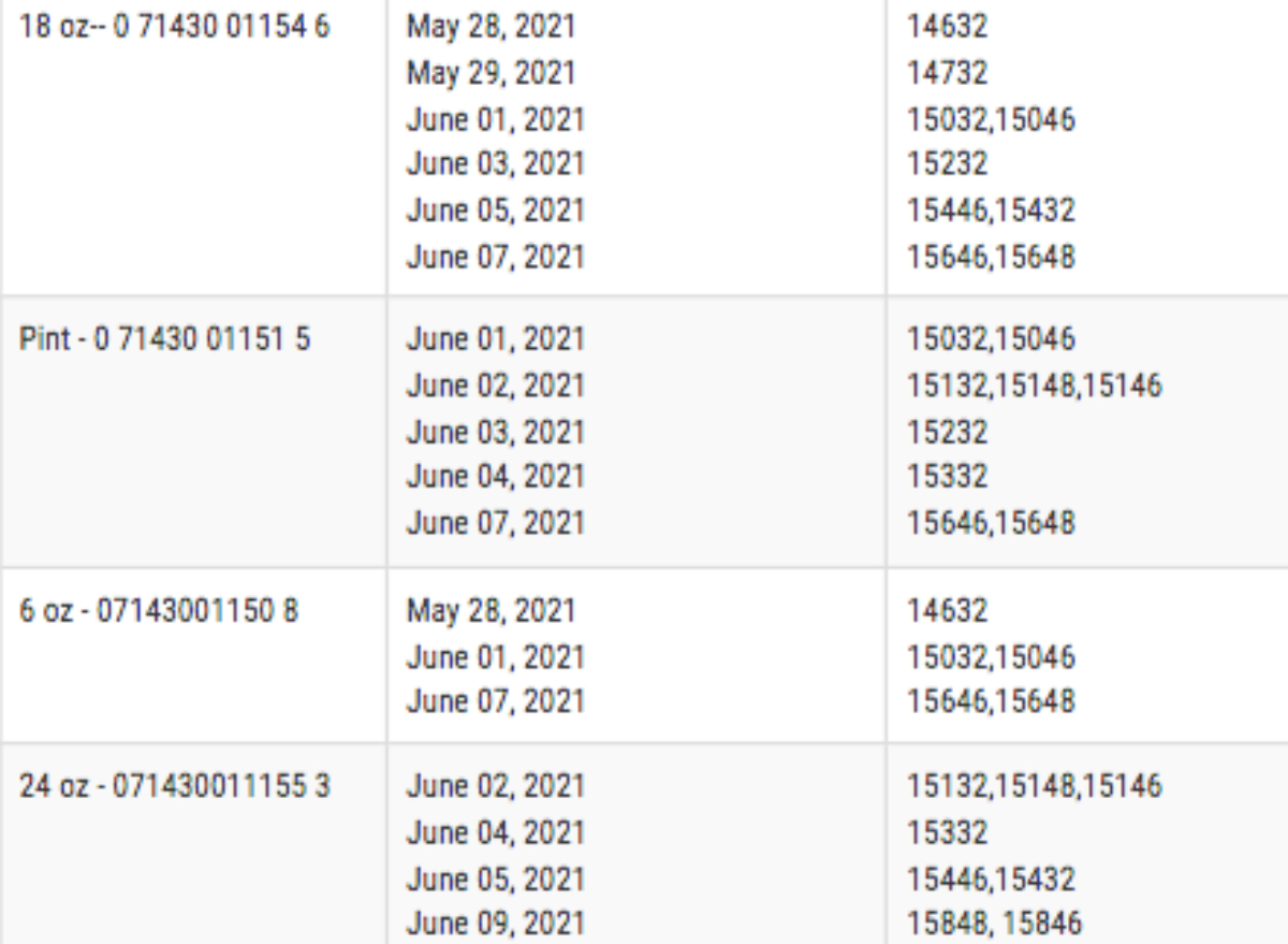 So,in Illinois, Maine, New York und Wisconsin (plus Alberta und British Columbia in Kanada), Dole erinnert sich an die Blaubeeren nach diesen Details, mit Höflichkeit der FDA, mit Spalten, die nach rechts bezeichnet werdenGröße / UPC, Pack-Out-Datum und Loscode: