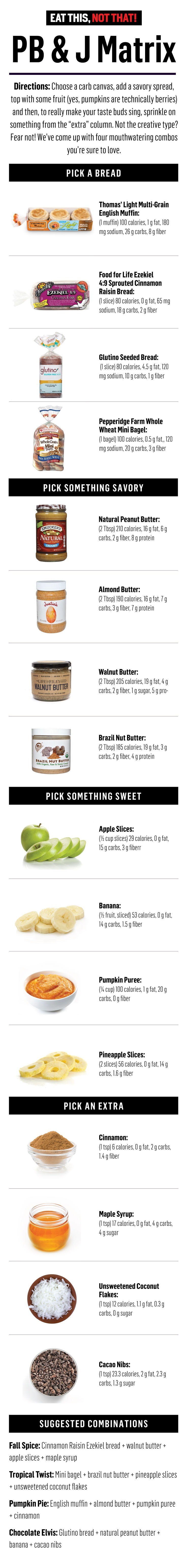 Um leckere Wendungen auf der klassischen Sammie zu machen, schauen Sie sich unsere PB & J-Matrix unten an. Es gibt mehr als 250 Möglichkeiten, die Zutaten zu mischen und anzupassen, vorausgesetzt, Sie ziehen einen aus jeder Spalte an. Nachdem Sie a ausgewählt haben Kohlenhydrat Leinwand, fügen Sie eine herzhafte Verbreitung hinzu, top mit einigen Früchten (ja, Kürbis ist technisch eine Beere), und dann, um Ihre Geschmacksknospen wirklich singen zu lassen, streuen Sie auf etwas aus der "Extra" -Säule. Nicht der kreative Typ? Keine Angst! Wir haben mit vier Mundwasserkombinationen gekommen, die Sie sicher lieben. Happy Noshing!