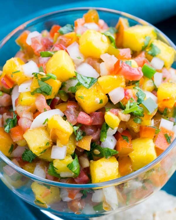 Tomate, Paprika, Jalapeno, Zwiebeln und Pfirsiche werden in Scheiben geschnitten und gewürfelt, in Kalksaft geworfen und mit Cilantro besprüht. Koppeln Sie dieses Rezept mitgesunde Chips. Für die perfekte sultless Sommer-App.