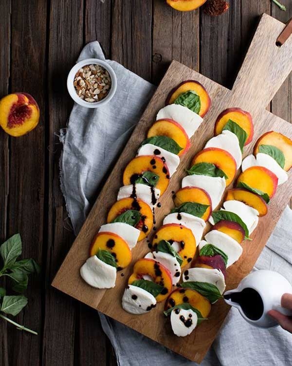 Tomate, Basilikum und Mozzarella Fladenbrot ist ein Deli-Favorit, aber haben Sie jemals daran gedacht, die Früchte zu tauschen? Der natürliche zuckerhaltige Geschmack der Pfirsiche ergänzt einwandfrei das reiche, cremige Mozzarella und das erfrischende Basilikum. So einfach, aber so genial!